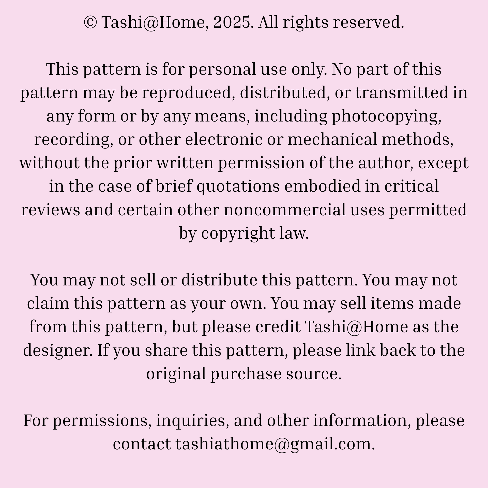 You may not sell or distribute this pattern. You may not claim this pattern as your own. You may sell items made from this pattern, but please credit Tashi@Home as the designer. If you share this pattern, please link back to the original purchase source.